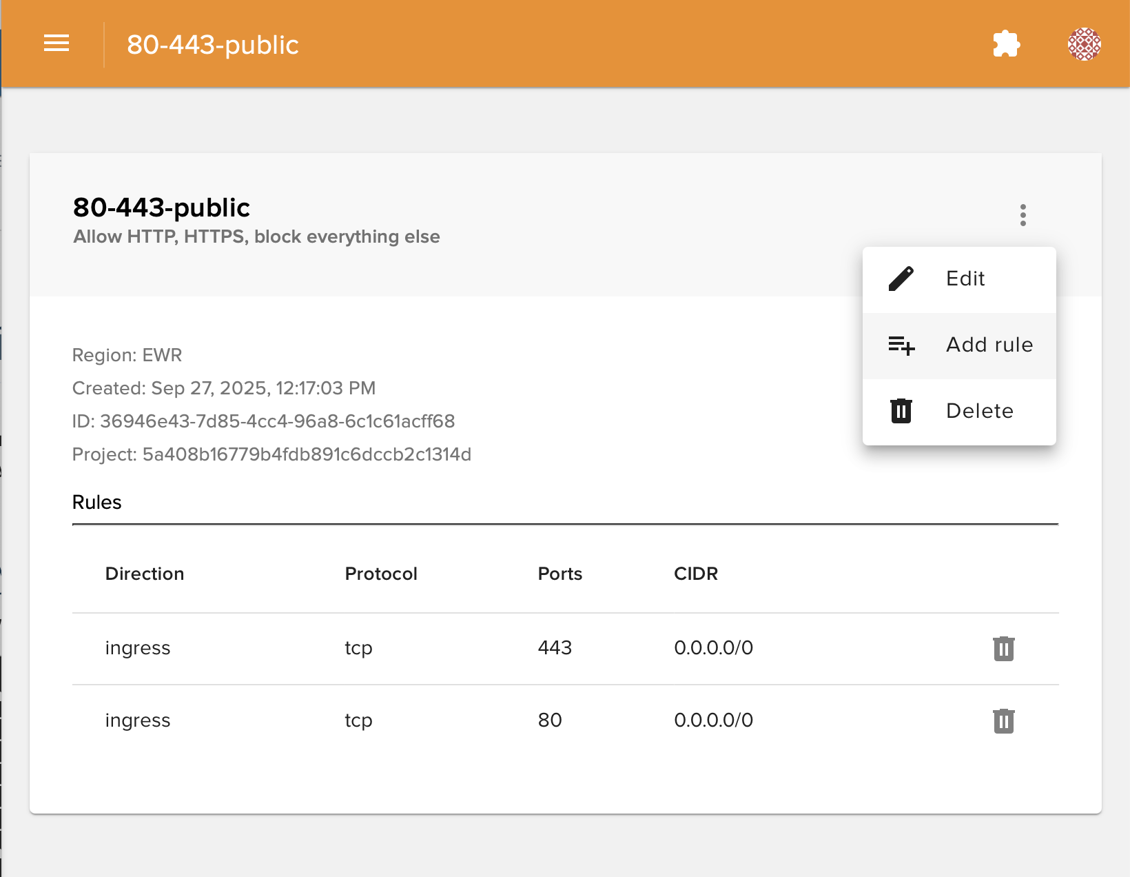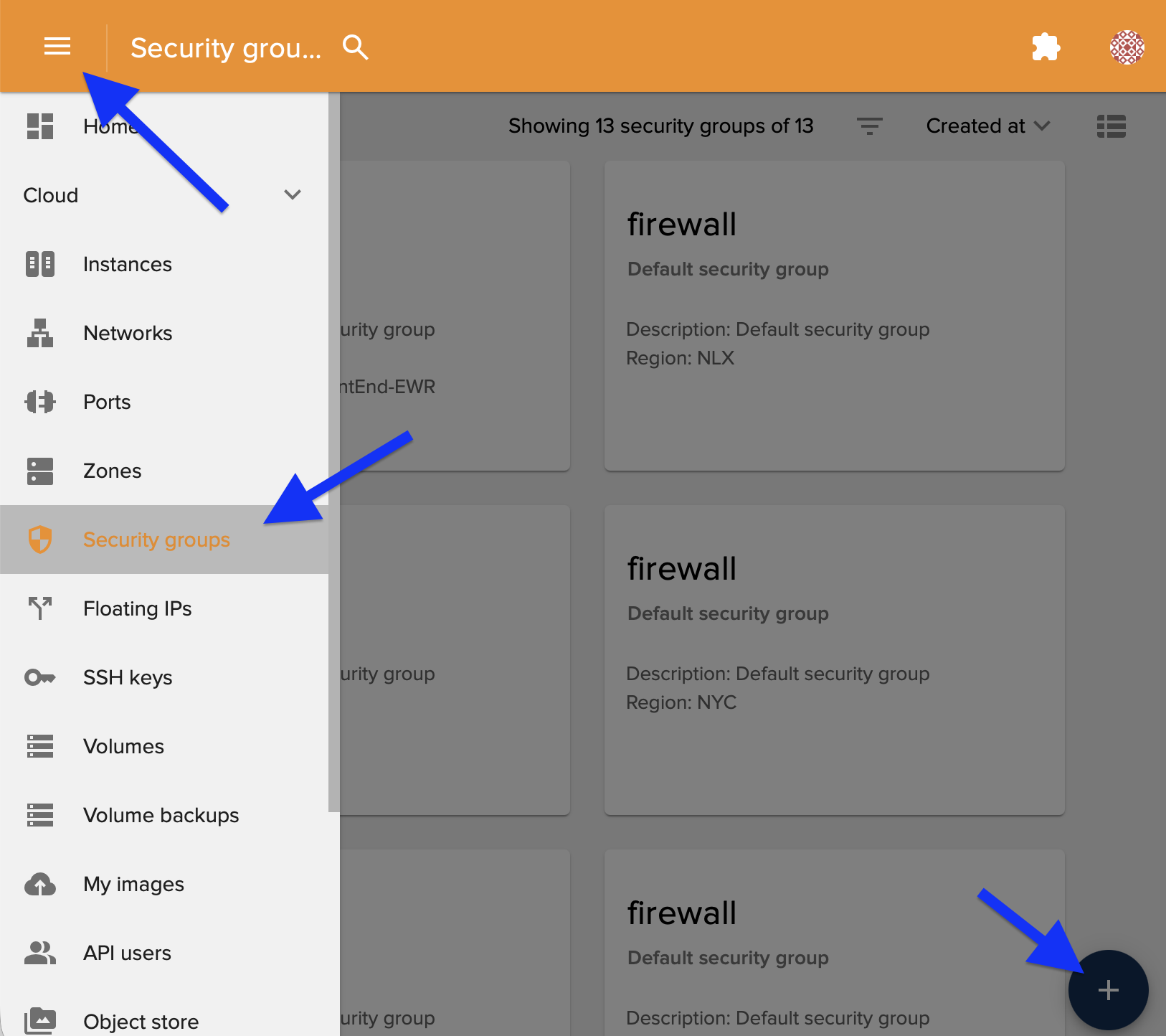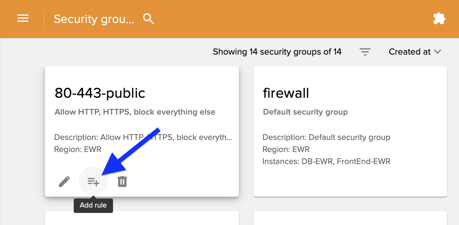 To define a security group, log into https://cloud.ramnode.com and select Security groups then Add