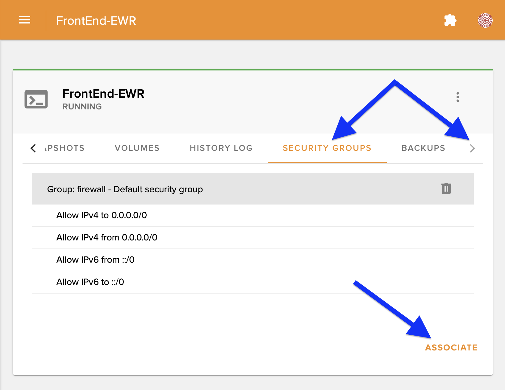 And scroll to the Security Groups tab, then select Associate